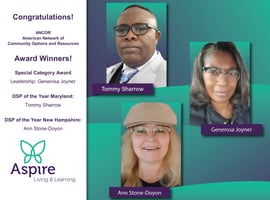 Ann Stone-Doyon, Tommy Sharrow, and Generosa Joyner were honored by ANCOR, the American Network of Community Options and Resources, at their national conference on June 14, 2021. ANCOR is the national association of providers supporting people with intellectual or developmental disabilities. Each year ANCOR selects those DSPs who have shown exceptional dedication and achieved life-changing outcomes in partnership with the people they support. One DSP of the Year is selected from each state. You can watch the awards ceremony here.